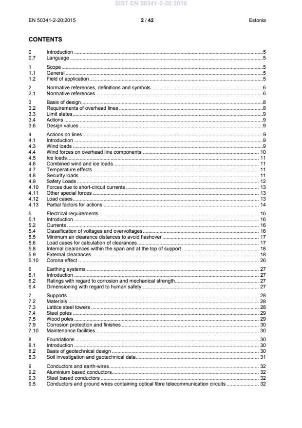 EN 50341-2-20:2015 is a standard published by CLC. Its full title is "Overhead electrical lines exceeding AC 1 kV - Part 2-20: National Normative Aspects (NNA) for ESTONIA (based on EN 50341-1:2012)". This standard covers: 1.1 General (NCPT) EE.1 Application to new lines This Part 2-20 applies to all new overhead electric lines with nominal system voltages exceeding AC 1 kV and with rated frequencies below 100 Hz. This standard also applies to D.C. overhead lines in structural aspects. (NCPT) EE.2 “New overhead line” A “new overhead line” means a completely new line between two points, A and B. A new branch line of the existing power line should be considered as a new power line including the junction support, for which specific requirements should be defined in the Project Specification. 1.2 Field of application (A-dev) EE.1 Application to mounting of telecommunication equipment The Standard EVS-EN 50341:2012 is applicable to fixing of structural elements for tele-communication (antennas, satellite dishes, All Dielectric Self Supporting (ADSS) equipment, etc.), if mounted on power line supports (towers), especially regarding wind forces and ice loads on such fixed elements. The design and installation should be done under the due control of the line owner and/or the competent authority. Mounting of telecommunication equipment on power line supports must be coordinated with line owner and stated in the Project Specification. If telecommunication equipment (antennas, dishes, etc.) will be installed in the transmission line supports, and their size, location or mounting will have major effects on the loads or design of the structures, the requirements of EVS-EN 1993-3 will also have to be taken into account. If such structures include conductive parts, the requirements on clearances in Section 5.8 should be applied. (NCPT) EE.2 Application to existing overhead lines The Standard EVS-EN 50341:2012 shall not be applied to maintenance, reconductoring, tee-offs, extensions or diversions to existing overhead lines in Estonia, unless specifically required in the Project Specification. In cases of major revisions of existing lines the degree of application of the Standard EVS-EN 50341:2012 should be agreed upon by the parties concerned and specified in the Project Specification. (NCPT) EE.3 Application to installations under construction or design Installations in the design and construction stage may be completed by using the standard valid at the beginning of planning unless otherwise agreed with the line owner and/or any other competent authority. It must also be determined in the Project Specification which previous National Standard and to what extent should be applied to the project in question.