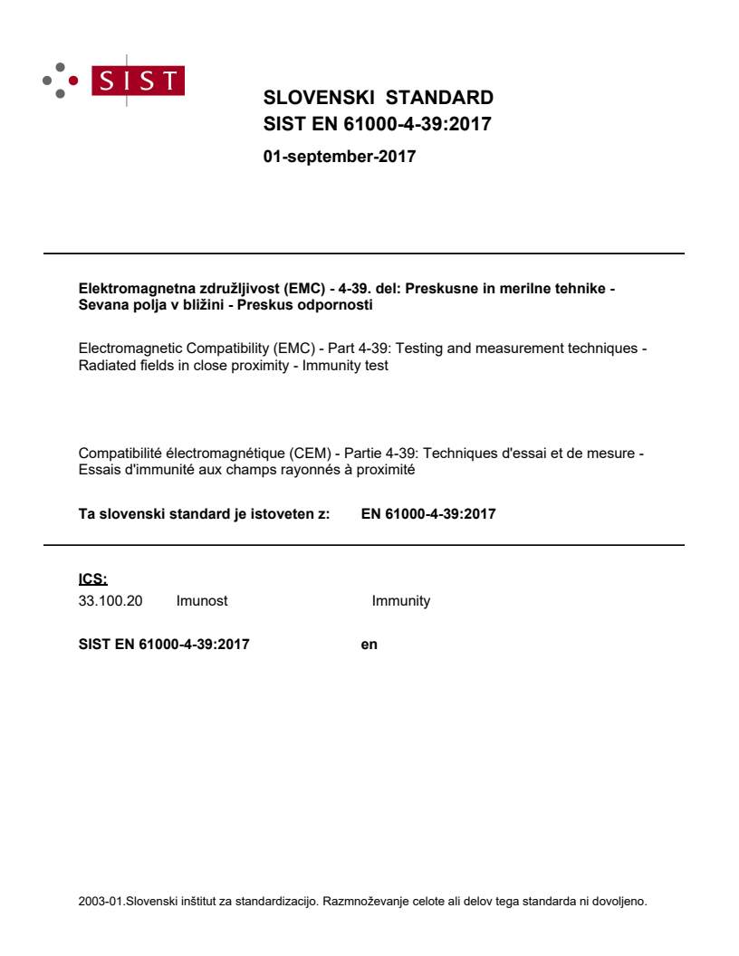 Elektromagnetna združljivost (EMC) - 4-39. del: Preskusne in merilne tehnike - Sevana polja v bližini - Preskus odpornosti