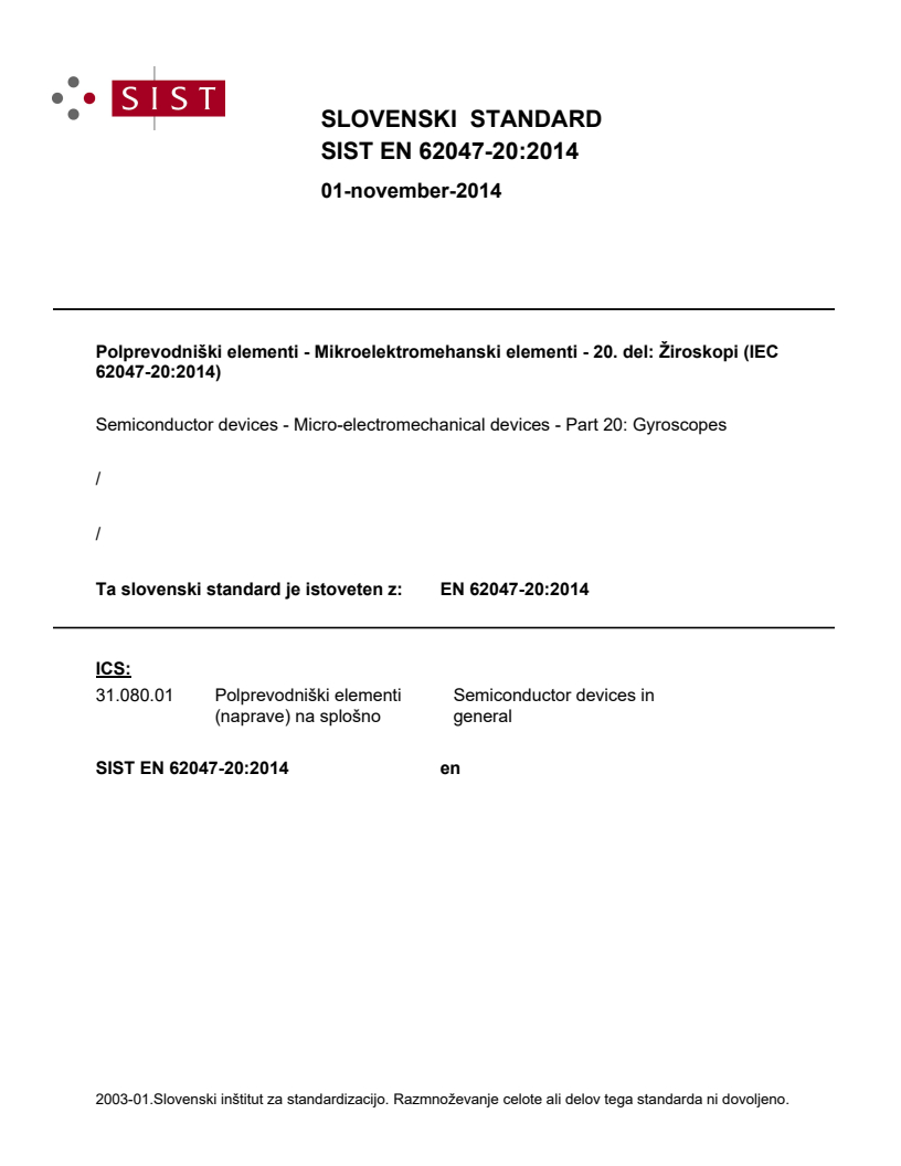 Keywords: EN 62047-20:2014, IEC 62047-20:2014, gyroscopes, MEMS gyroscopes, micro-electromechanical devices, semiconductor devices, scale factor, bias, output noise, frequency response, measurement methods.