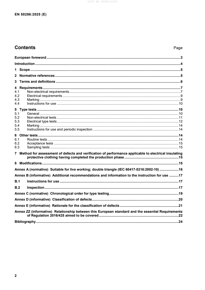 This document is applicable to electrical insulating protective clothing used by skilled persons when they are working on or near live parts of low-voltage installations at nominal voltages up to 500 V AC. The purpose of this clothing is to prevent dangerous current from passing through persons when there is a risk of unintentional contact with several live parts located in and around the working area. This document does not deal with protection against the effects of an electric arc, DC applications and voltages higher than 500 AC. The products designed and manufactured according to this document contribute to the safety of the users provided they are used by skilled persons, in accordance with safe methods of work and the instructions for use.
