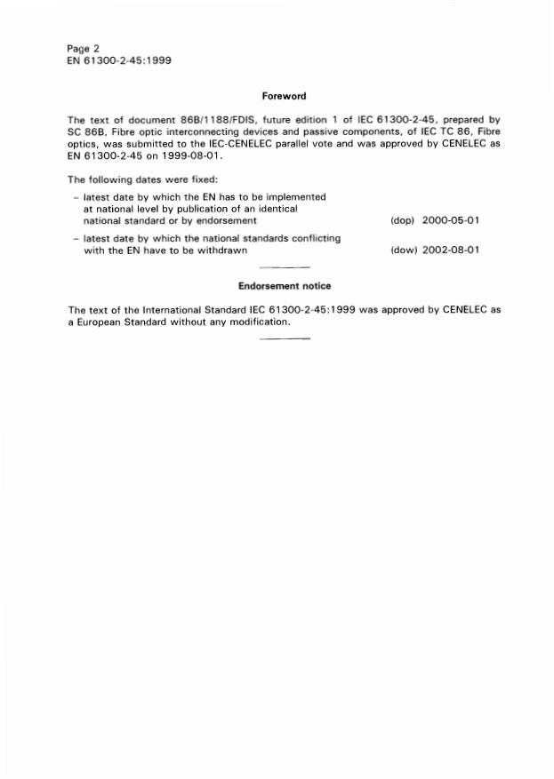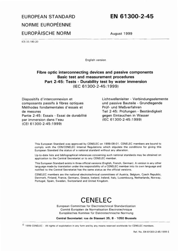 EN 61300-2-45:1999 is a standard developed by the CLC (European Committee for Electrotechnical Standardization) that focuses on the durability testing of fibre optic interconnecting devices and passive components through water immersion. This part of the EN 61300 series establishes test and measurement procedures designed to assess the resistance of fibre optic components to water-induced degradation during their operational service life. The standard ensures that optical devices maintain functionality and reliability even when exposed to moisture environments, an essential factor in telecommunications and industrial applications.