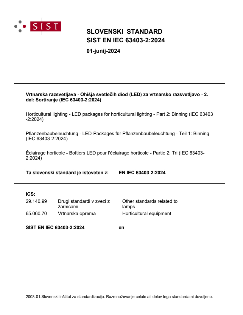 Vrtnarska razsvetljava - Ohišja svetlečih diod (LED) za vrtnarsko razsvetljavo - 2. del: Sortiranje (IEC 63403-2:2024)