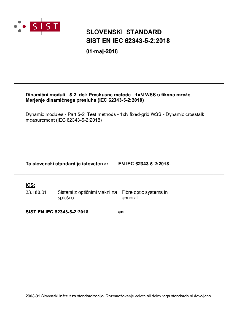 EN IEC 62343-5-2:2018 - Dynamic modules (CLC) Title: Dynamic modules - Part 5-2: Test methods - 1xN fixed-grid WSS - Dynamic crosstalk measurement