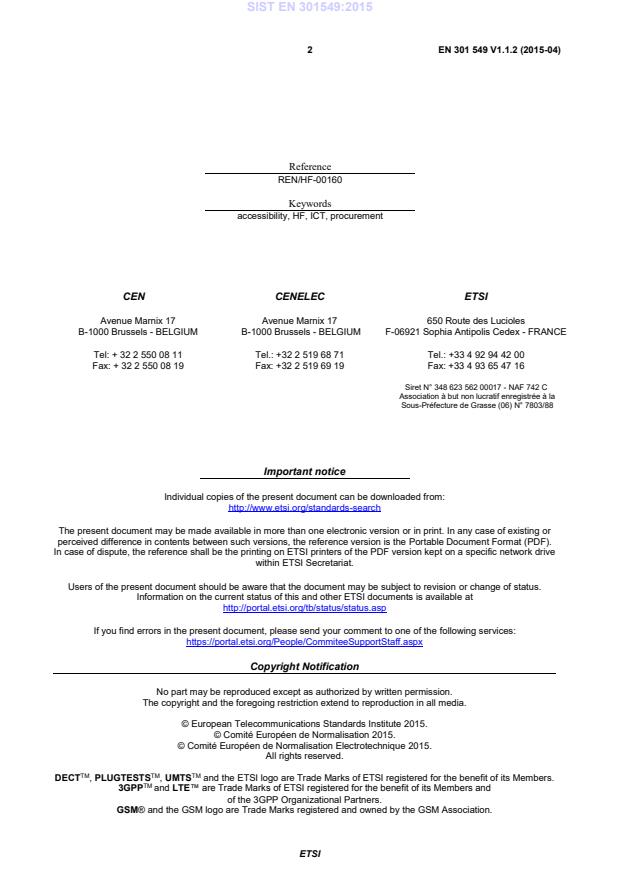 DECTTM, PLUGTESTSTM, UMTSTM and the ETSI logo are Trade Marks of ETSI registered for the benefit of its Members. 3GPPTM and LTE™ are Trade Marks of bTSf registered for the benefit of its Members and of the 3GPP Organizational Partners. GSM® and the GSM logo are Trade Marks registered and owned by the GSM Association. SIST EN 301549:2015