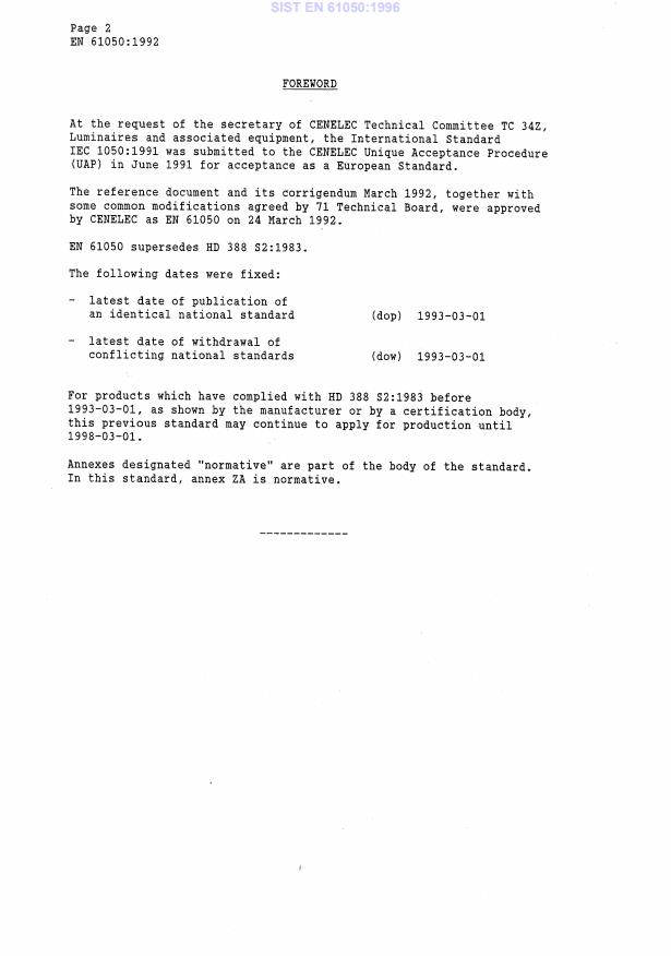 EN 61050:1992 has the following relationships with other standards: It is inter standard links to HD 243 S12:1995, HD 214 S2:1980, EN 60529:1991, EN 61048:1993, EN 60598-2-14:2009, EN 61050:1992/A1:1995. Understanding these relationships helps ensure you are using the most current and applicable version of the standard.