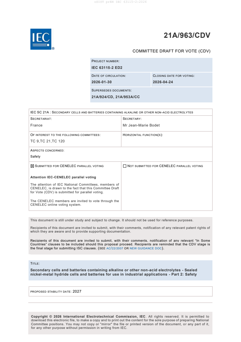 prEN IEC 63115-2:2026 is a draft international standard developed by the International Electrotechnical Commission (IEC), under the subcommittee SC 21A, focusing on secondary cells and batteries containing alkaline or other non-acid electrolytes. Specifically, this part addresses the safety requirements for sealed nickel-metal hydride (NiMH) cells and batteries used in industrial applications. Standardization in this area is vital due to the widespread industrial use of NiMH batteries in equipment requiring reliable and safe rechargeable power sources.