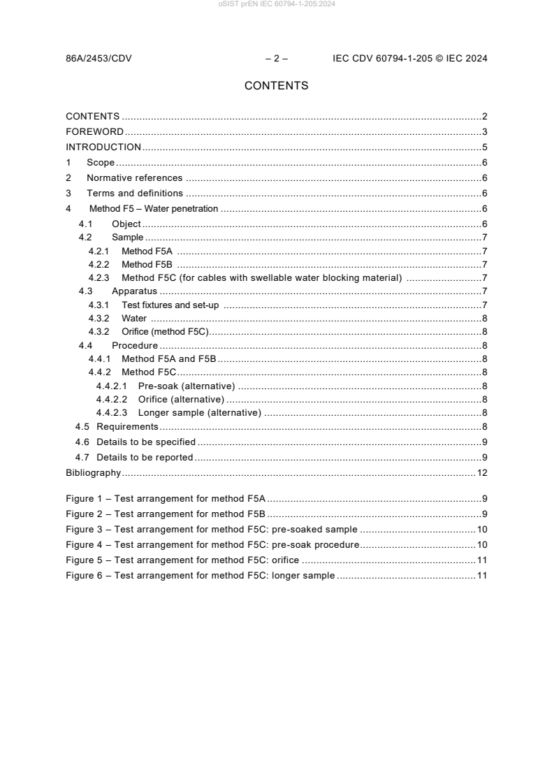 The prEN IEC 60794-1-205:2025 is an important international standard published by the International Electrotechnical Commission (IEC) under the European CLC framework. This standard focuses on optical fibre cables and provides generic specifications for basic optical cable test procedures, specifically addressing environmental test methods for water penetration using Method F5.