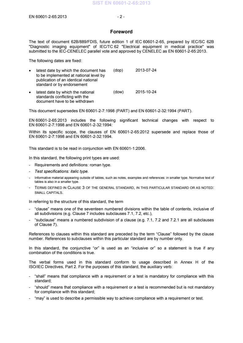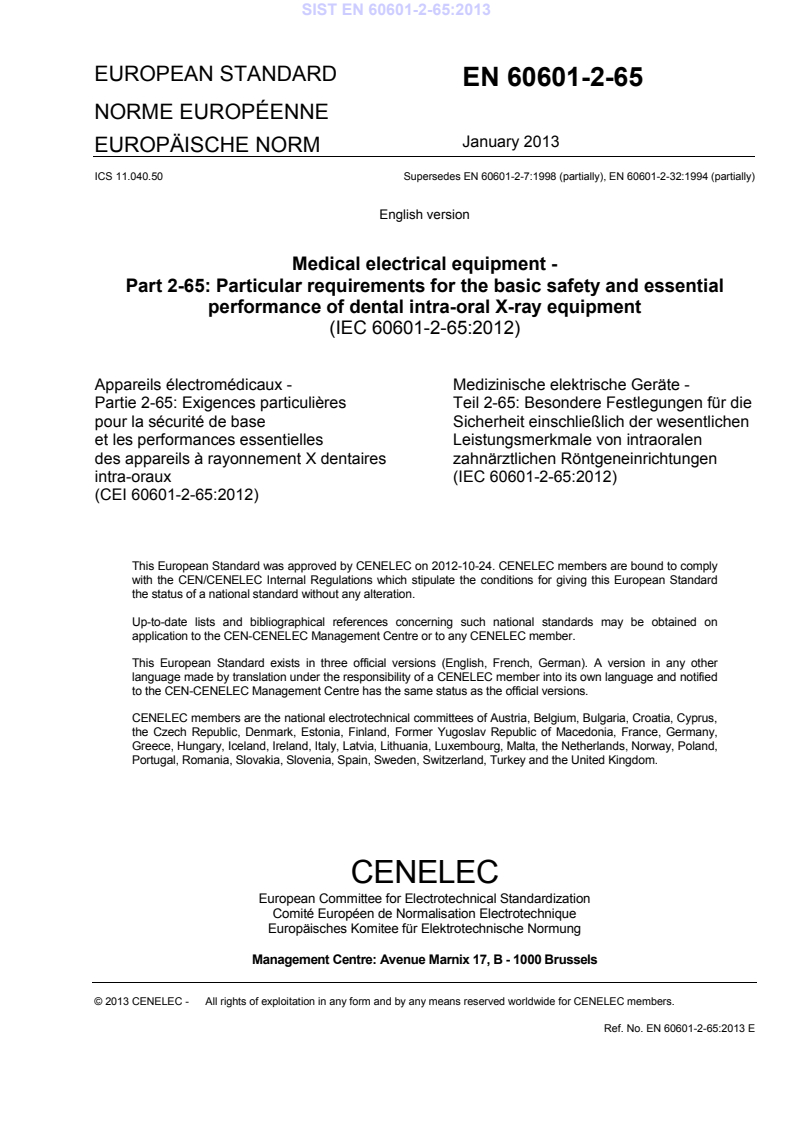 EN 60601-2-65:2013 is a standard published by CLC. Its full title is "Medical electrical equipment - Part 2-65: Particular requirements for the basic safety and essential performance of dental intra-oral X-ray equipment". This standard covers: IEC 60601-2-65:2012 applies to the basic safety and essential performance of dental intra-oral X-ray equipment and its main components. The scope of this standard is restricted to X-ray equipment where the X-ray tube assembly contains the high-voltage transformer assembly. Dental extra-oral X-ray equipment is excluded from the scope of this standard. This particular standard has been prepared to provide, based on IEC 60601-1:2005 and its collaterals, a complete set of basic safety and essential performance requirements for dental intra-oral X-ray equipment. While the previously existing standards for such equipment were dedicated to components and subsystems, this particular standard addresses the system level of dental intra-oral X-ray equipment. Components and their functions are addressed as far as necessary.
