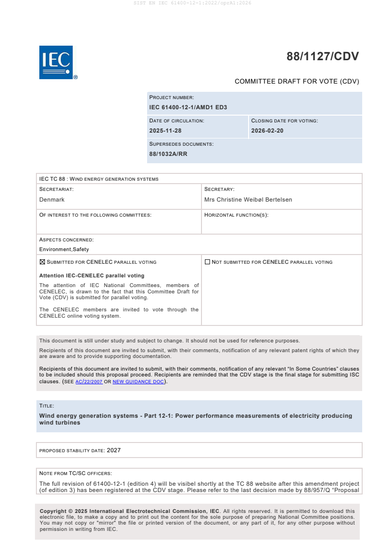 By staying current with EN IEC 61400-12-1:2022/prA1:2025, stakeholders in the wind energy market gain improved accuracy, transparency, and comparability in turbine power performance assessment, supporting more reliable project outcomes and streamlined certification processes.