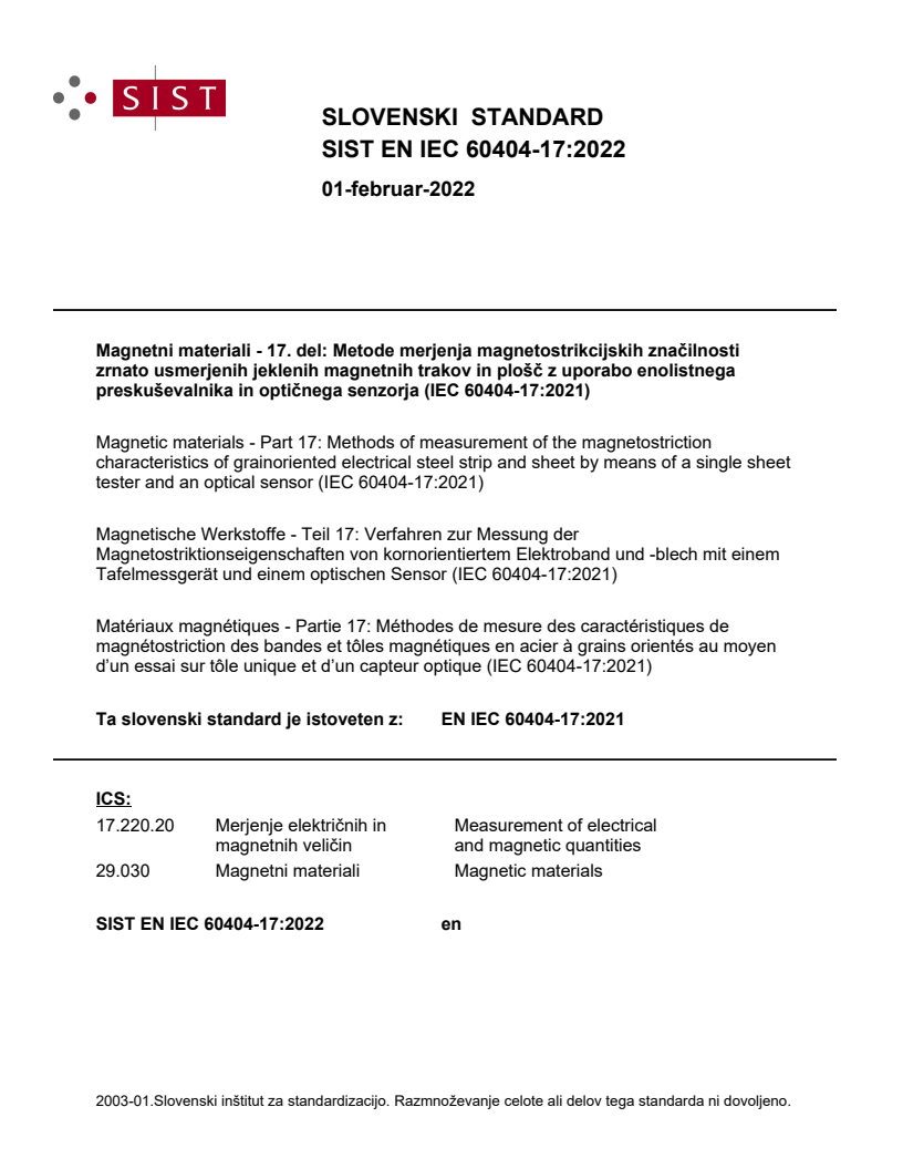 Magnetni materiali - 17. del: Metode merjenja magnetostrikcijskih značilnosti zrnato usmerjenih jeklenih magnetnih trakov in plošč z uporabo enolistnega preskuševalnika in optičnega senzorja (IEC 60404-17:2021)