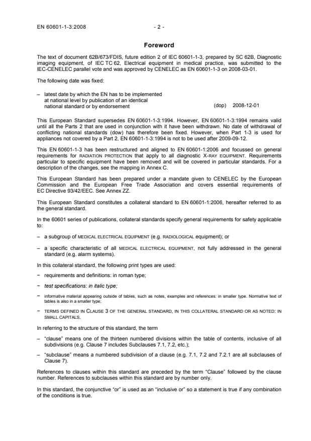 EN 60601-1-3:2008 is a standard published by CLC. Its full title is "Medical electrical equipment - Part 1-3: General requirements for basic safety and essential performance - Collateral Standard: Radiation protection in diagnostic X-ray equipment". This standard covers: This collateral standard applies to X-ray equipment and to subassemblies of such equipment, where radiological images of a human patient are used for diagnosis, planning or guidance of medical procedures. The object of this collateral standard is to establish general requirements for protection against X-radiation in X-ray equipment, in order that the irradiation of the human patient, the operator, staff and members of the public can be kept as low as reasonably achievable, without jeopardizing the benefit of the radiological procedure. Particular standards may specify their appropriate values and/or measures for general requirements specified in this collateral standard. The implementation of the general requirements or the reference to the particular standard instead, shall be justified in the risk management process. This collateral standard considers radiation protection aspects related to X-radiation only. Requirements for the control of the electrical energy used to generate X-radiation, which is also an important aspect of radiation protection, are included in IEC 60601-1 and in particular standards for the safety and essential performance of the equipment concerned. This document cancels and replaces the first edition of IEC 60601-1-3, published in 1994 (which replaced IEC 407 issued in 1973). It constitutes a technical revision. This edition has been restructured and aligned to IEC 60601-1(2005) and focussed on general requirements for RADIATION PROTECTION that apply to all diagnostic X-RAY EQUIPMENT. Requirements particular to specific equipment have been removed and will be covered in particular standards. For a description of the changes, see the mapping in Annex C.