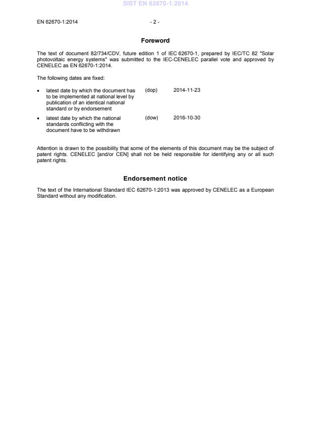EN 62670-1:2014 is a standard published by CLC. Its full title is "Photovoltaic concentrators (CPV) - Performance testing - Part 1: Standard conditions". This standard covers: IEC 62670-1:2013 defines standard conditions for assessing the power produced by CPV systems and their photovoltaic subcomponents. The object is to define a consistent set of conditions so that power ratings noted on data sheets and nameplates will have a standard basis. Two sets of conditions are included to characterize: a) operating conditions, and b) test conditions.