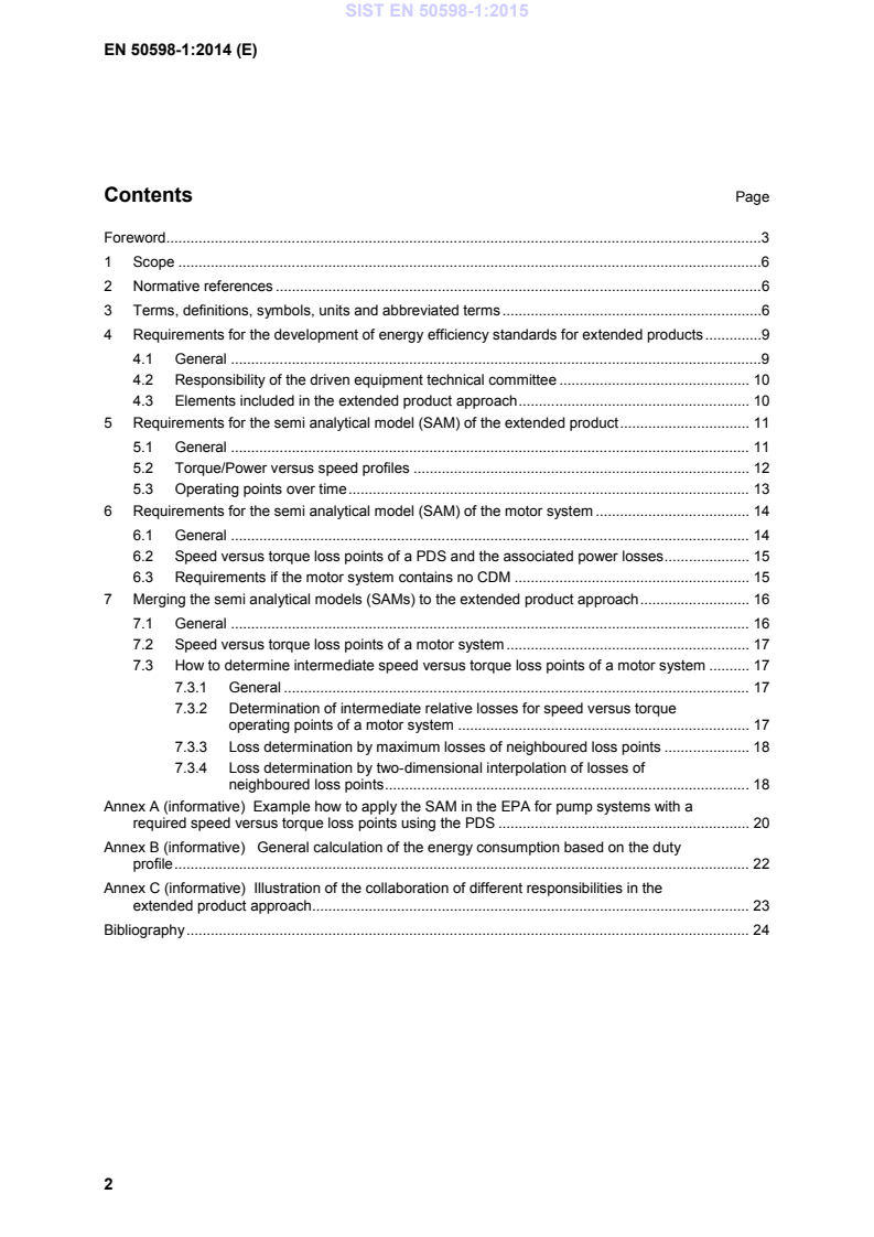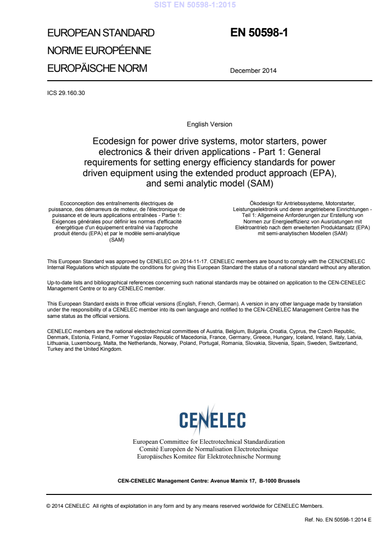 EN 50598-1:2014 is a standard published by CLC. Its full title is "Ecodesign for power drive systems, motor starters, power electronics & their driven applications - Part 1: General requirements for setting energy efficiency standards for power driven equipment using the extended product approach (EPA), and semi analytic model (SAM)". This standard covers: This European Standard provides a general methodology to energy efficiency standardization for any extended product including a motor system by using the methodological guidance of the extended product approach (EPA). It enables product committees for driven equipment with included motor systems to interact with the relative power losses of the included motor system (e.g. PDS) in order to determine the system energy efficiency aspects for the extended product by calculation. This should be based on specified calculation models for speed/load profiles, the load-time profiles and relative power losses of appropriate torque versus speed operating points. This part of the EN 50598 series specifies the methodology of determination of losses of the extended product including a motor system and its sub-parts. This framework is explained by an example for pumps. This part of the standard does not specify requirements for environmental impact declarations.