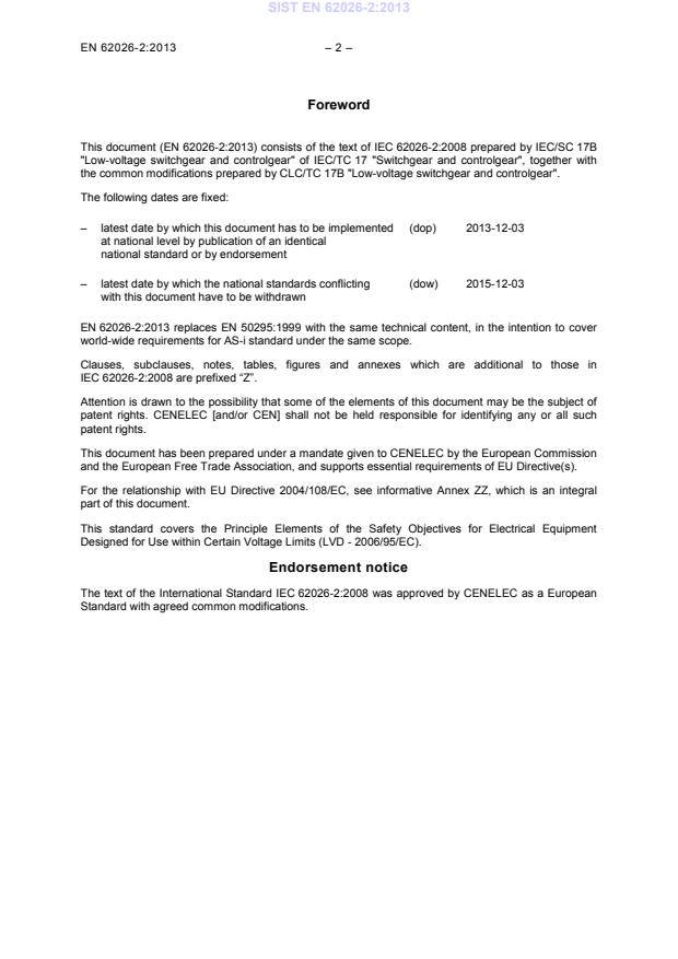 – 2 – Foreword This document (EN 62026-2:2013) consists of the text of IEC 62026-2:2008 prepared by IEC/SC 17B "Low-voltage switchgear and controlgear" of IEC/TC 17 "Switchgear and controlgear", together with the common modifications prepared by CLC/TC 17B "Low-voltage switchgear and controlgear". The following dates are fixed: – latest date by which this document has to be implemented at national level by publication of an identical national standard or by endorsement (dop) 2013-12-03 – latest date by which the national standards conflicting with this document have to be withdrawn (dow) 2015-12-03 EN 62026-2:2013 replaces EN 50295:1999 with the same technical content, in the intention to cover world-wide requirements for AS-i standard under the same scope. Clauses, subclauses, notes, tables, figures and annexes which are additional to those in IEC 62026-2:2008 are prefixed “Z”. Attention is drawn to the possibility that some of the elements of this document may be the subject of patent rights. CENELEC [and/or CEN] shall not be held responsible for identifying any or all such patent rights. This document has been prepared under a mandate given to CENELEC by the European Commission and the European Free Trade Association, and supports essential requirements of EU Directive(s). For the relationship with EU Directive 2004/108/EC, see informative Annex ZZ, which is an integral part of this document. This standard covers the Principle Elements of the Safety Objectives for Electrical Equipment Designed for Use within Certain Voltage Limits (LVD - 2006/95/EC). Endorsement notice The text of the International Standard IEC 62026-2:2008 was approved by CENELEC as a European Standard with agreed common modifications. SIST EN 62026-2:2013