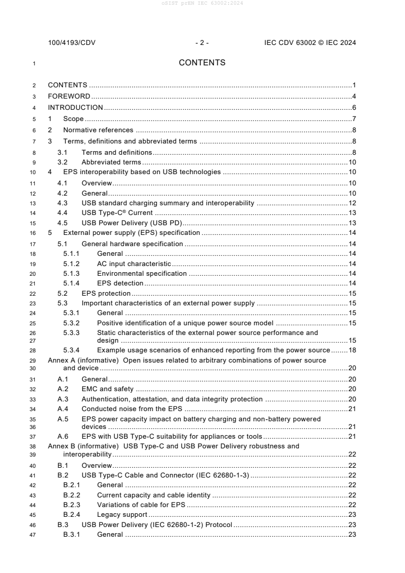 EN IEC 63002:2025 is a draft published by CLC. Its full title is "Interoperability specifications and communication method for external power supplies used with computing and consumer electronics devices". This standard covers: IEC 63002:2025 defines common charging interoperability guidelines for power sources (external power supplies (EPSs) and other Sources) used with computing and consumer electronics devices that implement IEC 62680‑1‑3 (USB Type-C® Cable and Connector Specification). This document defines normative requirements for an EPS to ensure interoperability; in particular, it specifies the data communicated from a power source to a device and certain safety elements of the EPS, cable, and device. While the requirements focus of this document is on the EPS and the behaviour at its USB Type-C connector interface, it is also important to comprehend cable assembly and device capabilities and behaviours in order to assure end-to-end charging interoperability. This document does not apply to all design aspects of an EPS. This document does not specify regulatory compliance requirements for aspects such as product safety, EMC, or energy efficiency. This document provides recommendations for the behaviour of a device when used with a power source compliant with this document. It specifies the minimum hardware specification for an EPS implementing IEC 62680‑1‑3. This document also specifies the data objects used by a charging system utilizing IEC 62680‑1‑2 to understand the identity, design and performance characteristics, and operating status of an external power supply. IEC 62680‑1‑2 focuses on power delivery applications ranging to 240 W for a variety of computing and consumer electronics devices including notebook computers, tablets, smartphones, small form-factor desktops, monitor displays and other multimedia devices. This document relies on established mechanical and electrical specifications, and communication protocols specified by IEC 62680‑1‑2 and IEC 62680‑1‑3. These specifications support methods for establishing the best performing interoperability between untested combinations of EPS and devices with the aim of improving consumer satisfaction. Information describing the USB charging interoperability model, overview of USB Type-C and USB Power Delivery specifications, and factors for charging performance are also provided to support implementation of this document. This third edition cancels and replaces the second edition published in 2021. This edition constitutes a technical revision. This edition includes the following significant technical changes with respect to the previous edition: a) power range is increased to 240 W; b) AVS mode is introduced; c) Annex A updates issues of arbitrary combinations of AC adapter and device; d) Annex B describes new safeguards for EPR mode; e) Annex C and Annex D are updated.