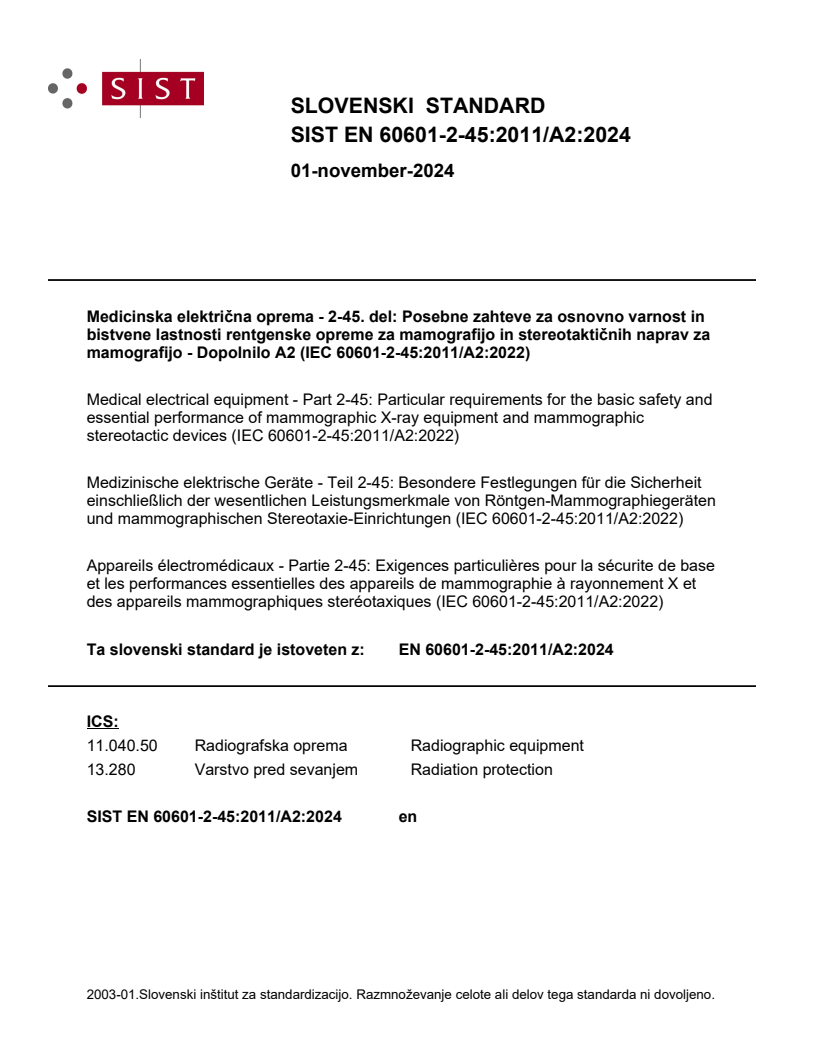 mamografijo - Dopolnilo A2 (IEC 60601-2-45:2011/A2:2022)