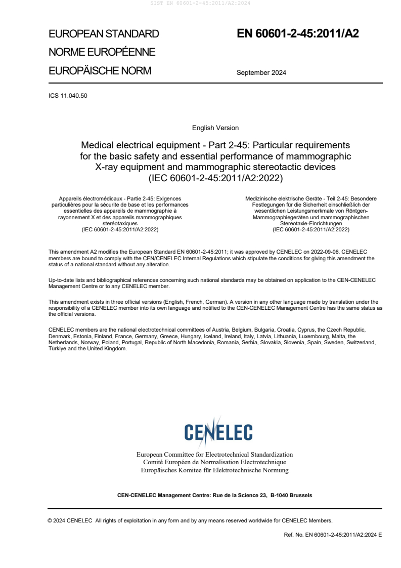 EN 60601-2-45:2011/A2:2024 is a amendment published by CLC. Its full title is "Medical electrical equipment - Part 2-45: Particular requirements for the basic safety and essential performance of mammographic X-ray equipment and mammographic stereotactic devices". This standard covers: Medical electrical equipment - Part 2-45: Particular requirements for the basic safety and essential performance of mammographic X-ray equipment and mammographic stereotactic devices