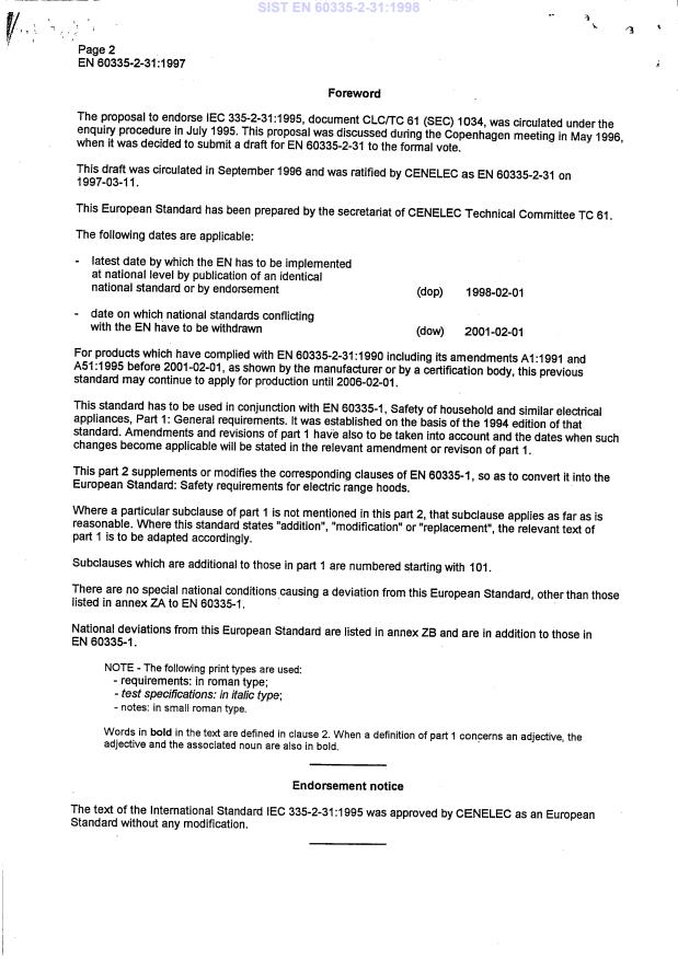 EN 60335-2-31:1997 is a standard published by CLC. Its full title is "Safety of household and similar electrical appliances - Part 2-31: Particular requirements for range hoods". This standard covers: Deals with the safety of electric range hoods intended for installing above household cooking ranges, hobs and similar cooking appliances, their rated voltage being not more than 250 V. Note: -The cooking appliance may be supplied by electricity or other fuels, such as gas. Is to be used in conjunction with EN 60335-1 (third edition).