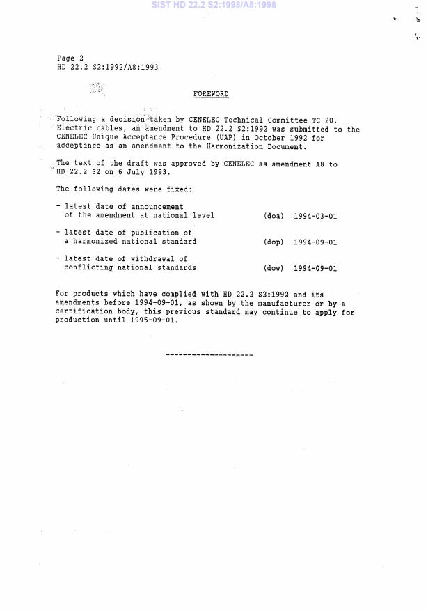 HD 22.2 S2:1992/A8:1993 is a amendment published by CLC. Its full title is "Rubber insulated cables of rated voltages up to and including 450/750 V - Part 2: Test methods". This standard covers: Certification period up to 1995-09-01