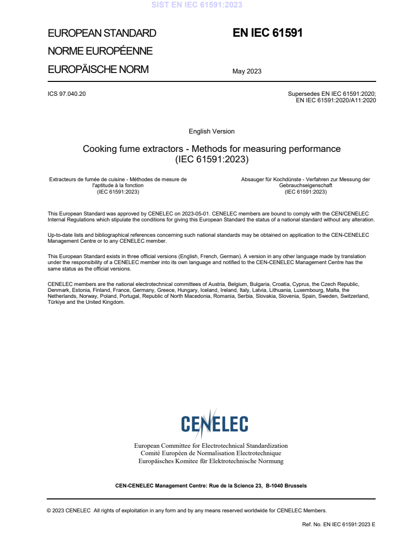 EN IEC 61591:2023 - “Cooking fume extractors - Methods for measuring performance” (CLC adoption of IEC 61591:2023) defines standardized test methods for measuring the performance characteristics of household cooking fume extractors (range hoods, downdraft systems and similar appliances). The standard covers extractors with integral fans or with externally mounted fans when the fan is defined in the appliance documentation and controlled by the appliance. It is a technical revision of the 2020 edition and focuses on measurement procedures rather than product classification or safety requirements.