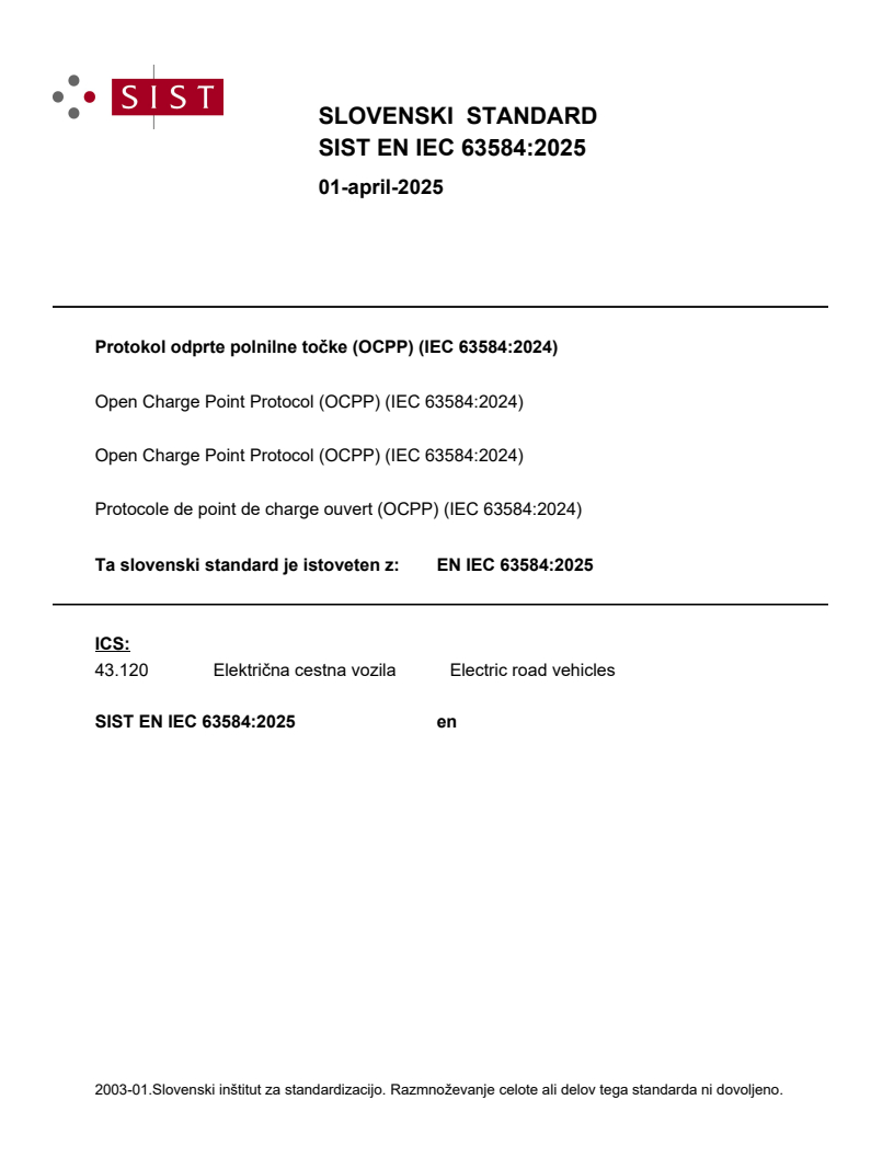 EN IEC 63584:2025 (adopting IEC 63584:2024) defines the Open Charge Point Protocol (OCPP) for communication between a Charging Station (EVSE) and a Charging Station Management System (CSMS). Based on OCPP 2.0.1 (Edition 3, 2024) and submitted via the Fast-Track procedure, this standard is the European adoption of the internationally recognized OCPP specification. It is an open, vendor-neutral protocol designed to enable interoperability, support diverse charging techniques and integrate EV charging into the Smart Grid.