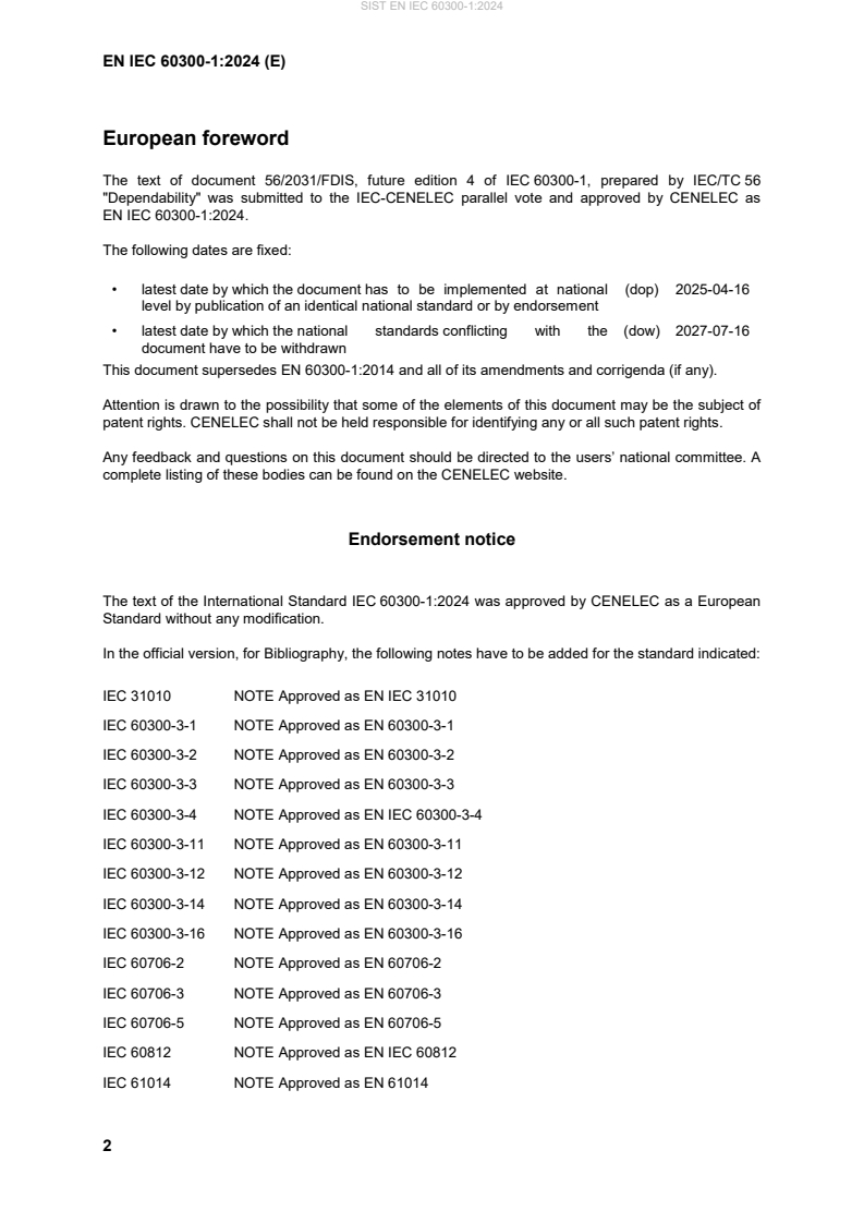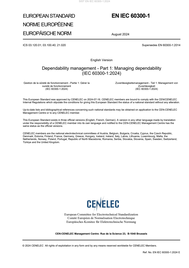 EN 60300-1:2014 - Dependability management - Part 1: Guidance for management and application - Effective Date