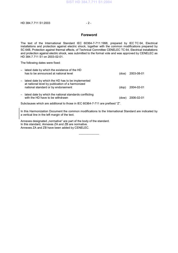 HD 384.7.711 S1:2003 is a standardization document published by CLC. Its full title is "Electrical installations of buildings - Part 7-711: Requirements for special installations or locations - Exhibitions, shows and stands". This standard covers: Gives requirements applying to the temporary electricalinstallations in exhibitions, shows and stands (including mobile and portable displays and equipment) to protect users.