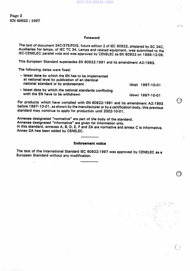 EN 60922:1997 has the following relationships with other standards: It is inter standard links to EN 61347-2-9:2001. Understanding these relationships helps ensure you are using the most current and applicable version of the standard.