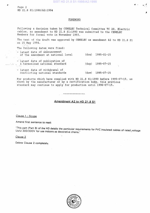 HD 21.8 S1:1990/A2:1994 is a amendment published by CLC. Its full title is "Polyvinyl chloride insulated cables of rated voltages up to and including 450/750 V - Part 8: Single core non-sheathed cables for decorative chains". This standard covers: Certification period up to 1996-07-01