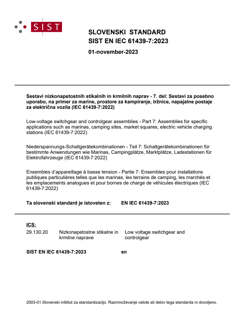 EN IEC 61439-7:2023 - Low-voltage switchgear and controlgear assemblies, Part 7 - specifies specific requirements for low-voltage assemblies for marinas, camping sites, market squares and electric vehicle charging stations. It complements the general rules in IEC/EN 61439-1:2020, replacing EN IEC 61439-7:2020. The standard covers assemblies with rated voltages up to 1 000 V AC or 1 500 V DC, intended for generation, transmission, distribution and control of electric energy, and for use by ordinary persons in public or temporary external sites.