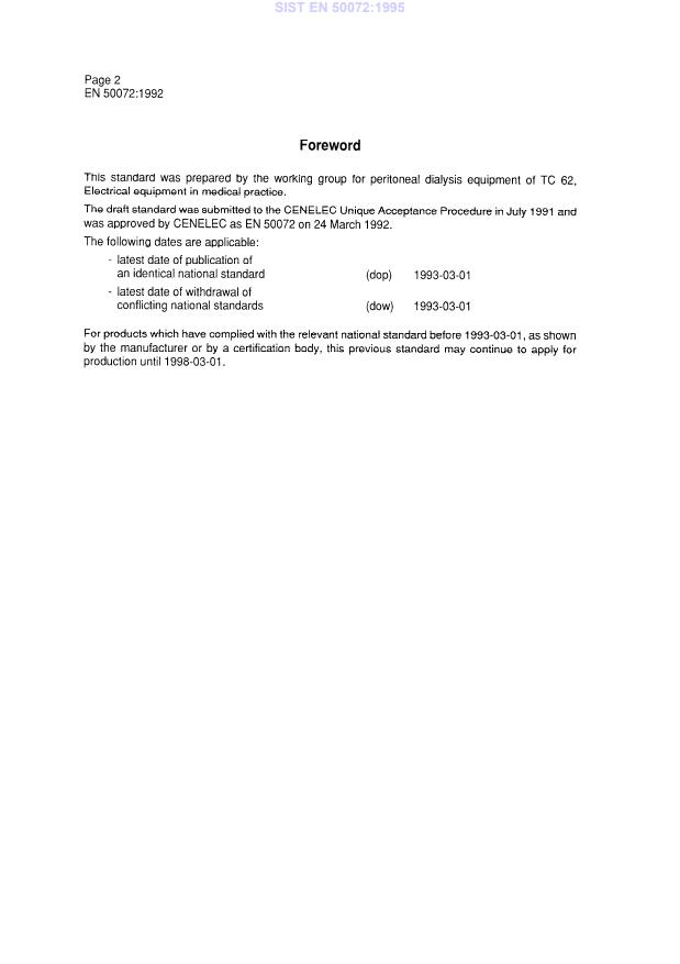 EN 50072:1992 is a standard published by CLC. Its full title is "Medical electrical equipment - Particular requirements for the safety of peritoneal dialysis equipment". This standard covers: This Particular Standard specifies the minimum safety requirements for PERITONEAL DIALYSIS EQUIPMENT as defined in Sub-clause 2.1.102. These devices are intended for use either by medical staff or under the supervision of medical expertise, including Peritoneal dyalisus equipment operated by the patient. These particular requirements do not apply to dialysing solution, the patient circuit or continuous ambulatory peritoneal dialysis equipment
