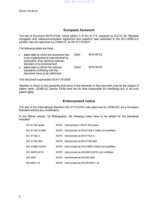 EN 61174:2015 (identical to IEC 61174:2015) specifies operational and performance requirements, test methods and required test results for Electronic Chart Display and Information Systems (ECDIS) used in maritime navigation. The standard is based on IMO resolution MSC.232(82) and references IHO publications (S-52, S-57, S-63, S-64) and related IEC/IMO documents. It is intended to ensure ECDIS functions meet internationally accepted performance levels while allowing implementation of new techniques provided they are not inferior to the stated requirements.