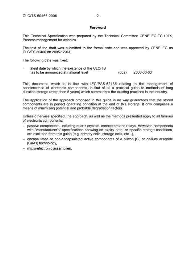 CLC/TS 50466:2006 is a technical specification published by CLC. Its full title is "Long duration storage of electronic components - Specification for implementation". This standard covers: This document, which is in line with IEC/PAS 62435 relating to the management of obsolescence of electronic components, is first of all a practical guide to methods of long duration storage (more than 5 years) which summarizes the existing practices in the industry.