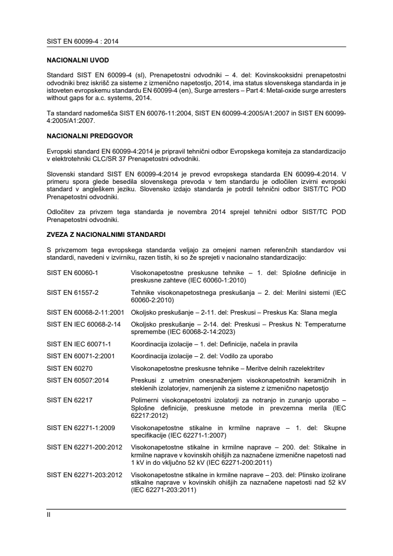 Prenapetostni odvodniki - 4. del: Kovinskooksidni prenapetostni odvodniki brez iskrišč za sisteme z izmenično napetostjo (IEC 60099-4:2014)