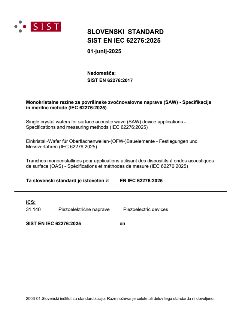 Monokristalne rezine za površinske zvočnovalovne naprave (SAW) - Specifikacije in merilne metode (IEC 62276:2025)