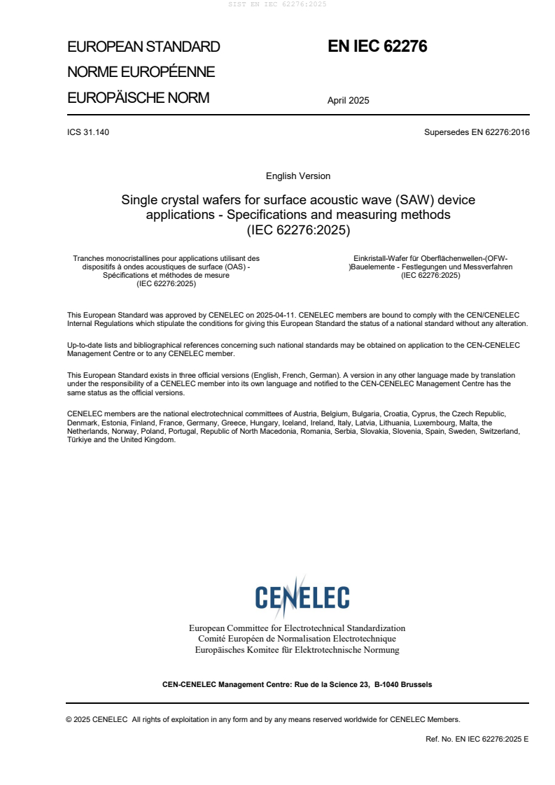 EN IEC 62276:2025 is a standard published by CLC. Its full title is "Single crystal wafers for surface acoustic wave (SAW) device applications - Specifications and measuring methods". This standard covers: IEC 62276:2025 applies to the manufacture of synthetic quartz, lithium niobate (LN), lithium tantalate (LT), lithium tetraborate (LBO), and lanthanum gallium silicate (LGS) single crystal wafers intended for use as substrates in the manufacture of surface acoustic wave (SAW) filters and resonators. This edition includes the following significant technical changes with respect to the previous edition: a) The terms and definitions, the technical requirements, sampling frequency, test methods and measurement of transmittance, lightness, colour difference for LN and LT have been added in order to meet the needs of industry development; b) The term “inclusion” (mentioned in 4.13 and 6.10) and its definition have been added because there was no definition for it in Clause 3; c) The specification of LTV and PLTV, and the corresponding description of sampling frequency for LN and LT have been added, because they are the key performance parameters for the wafers; d) The tolerance of Curie temperature specification for LN and LT have been added in order to meet the development requirements of the industry; e) Measurement of thickness, TV5, TTV, LTV and PLTV have been completed, including measurement principle and method of thickness, TV5, TTV, LTV and PLTV.