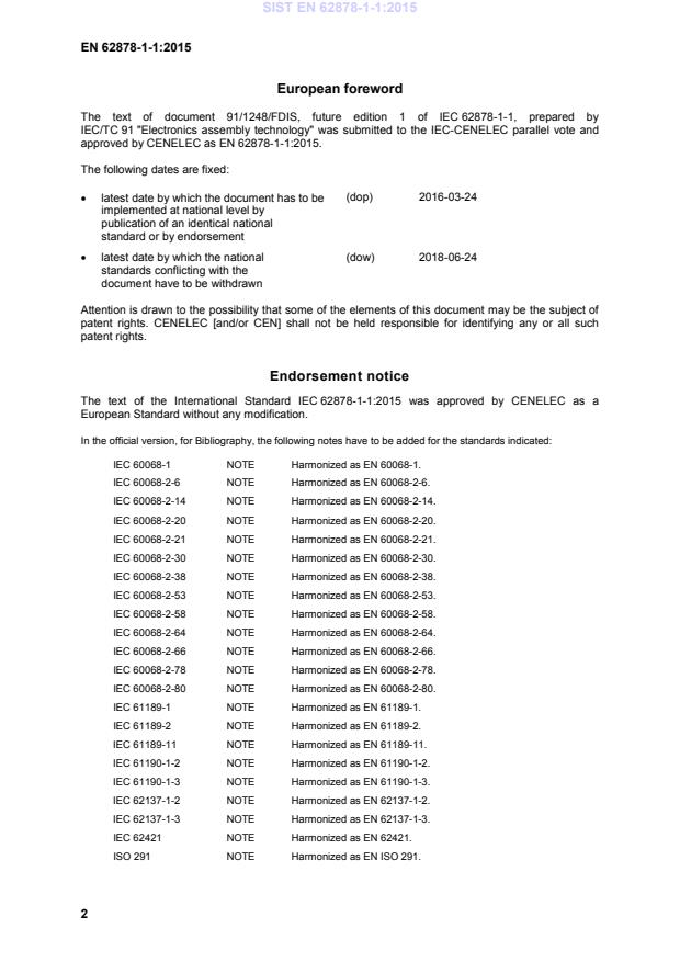 IEC 60068-1 NOTE Harmonized as EN 60068-1. IEC 60068-2-6 NOTE Harmonized as EN 60068-2-6. IEC 60068-2-14 NOTE Harmonized as EN 60068-2-14. IEC 60068-2-20 NOTE Harmonized as EN 60068-2-20. IEC 60068-2-21 NOTE Harmonized as EN 60068-2-21. IEC 60068-2-30 NOTE Harmonized as EN 60068-2-30. IEC 60068-2-38 NOTE Harmonized as EN 60068-2-38. IEC 60068-2-53 NOTE Harmonized as EN 60068-2-53. IEC 60068-2-58 NOTE Harmonized as EN 60068-2-58. IEC 60068-2-64 NOTE Harmonized as EN 60068-2-64. IEC 60068-2-66 NOTE Harmonized as EN 60068-2-66. IEC 60068-2-78 NOTE Harmonized as EN 60068-2-78. IEC 60068-2-80 NOTE Harmonized as EN 60068-2-80. IEC 61189-1 NOTE Harmonized as EN 61189-1. IEC 61189-2 NOTE Harmonized as EN 61189-2. IEC 61189-11 NOTE Harmonized as EN 61189-11. IEC 61190-1-2 NOTE Harmonized as EN 61190-1-2. IEC 61190-1-3 NOTE Harmonized as EN 61190-1-3. IEC 62137-1-2 NOTE Harmonized as EN 62137-1-2. IEC 62137-1-3 NOTE Harmonized as EN 62137-1-3. IEC 62421 NOTE Harmonized as EN 62421. ISO 291 NOTE Harmonized as EN ISO 291. SIST EN 62878-1-1:2015
