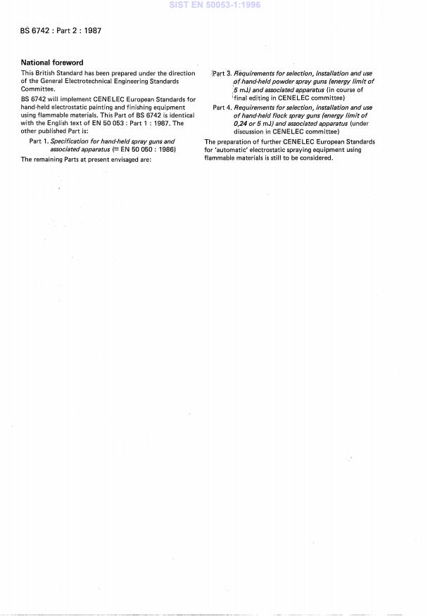 EN 50053-1:1987 is a standard published by CLC. Its full title is "Requirements for the selection, installation and use of electrostatic spraying equipment for flammable materials - Part 1: Hand-held electrostatic paint spray guns with an energy limit of 0,24 mJ and their associated apparatus". This standard covers: This European Standard gives requirements for the selection, installation and safe use of hand-held electrostatic spray guns with an energy limit of 0,24 mJ and their associated apparatus complying with EN 50 050, which may cause an explosive atmosphere when spraying flammable liquid. This European Standard considers only the hazards that are specific to the electrostatic characteristics of the electrostatic spraying process. For other aspects such as classification of hazardous areas (e.g. classification into zones), selection, installation and use of electrical equipment in hazardous areas, health hazards (e.g. toxic and skin effects, electric shock), cleaning of paint spraying areas, fire hazard from external sources, storage and handling of flammable liquids, national regulations apply