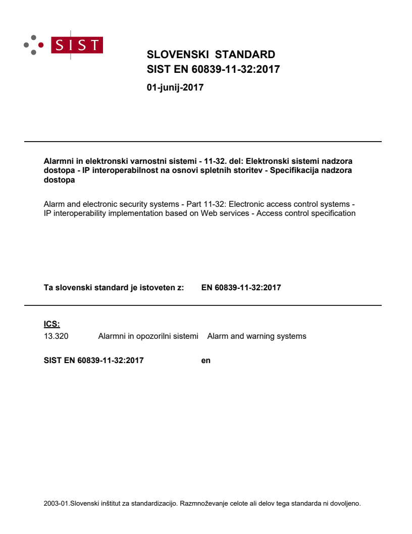Keywords: EN 60839-11-32:2017, electronic access control, access control monitoring, Web services interface, IP interoperability, IEC 60839, door control, access point state, WSDL, XML schema.
