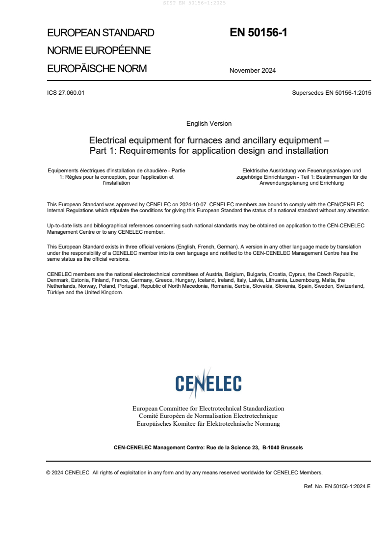 EN 50156-1:2024 - Electrical equipment for furnaces and ancillary equipment, Part 1 - sets requirements for the application design and installation of electrical equipment, control circuits and safety‑related systems for furnaces fired by solid, liquid or gaseous fuels. It is a CENELEC European standard (EN 50156‑1 approved 2024) adopted as the Slovenian standard in 2025.