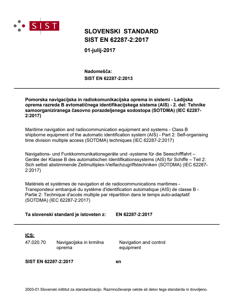 Pomorska navigacijska in radiokomunikacijska oprema in sistemi - Ladijska oprema razreda B avtomatičnega identifikacijskega sistema (AIS) - 2. del: Tehnike samoorganiziranega časovno porazdeljenega sodostopa (SOTDMA) (IEC 62287-2:2017)