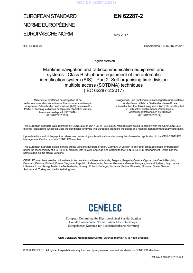 Keywords: EN 62287-2:2017, IEC 62287-2:2017, Class B AIS, SOTDMA, automatic identification system, Message 27, channels 75 and 76, maritime navigation, radiocommunication, AIS testing.