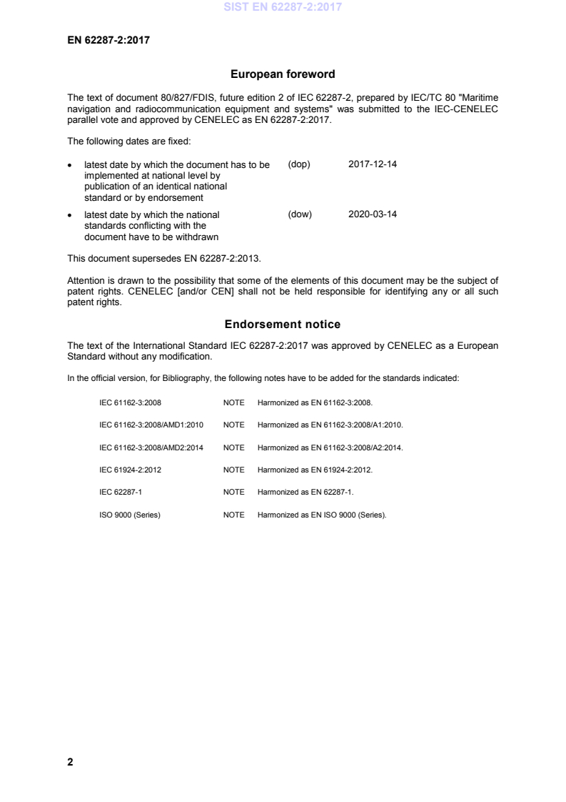 EN 62287-2:2017 (identical to IEC 62287-2:2017) specifies operational and performance requirements, methods of testing and required test results for Class B "SO" shipborne AIS equipment using self-organising time division multiple access (SOTDMA) techniques. The standard covers functionality, environmental and EMC requirements, internal GNSS position reporting, link and network layer behaviour, user interfaces, and test conditions. A key technical change in this edition is the introduction of transmission of Message 27 on channels 75 and 76 for long-range broadcast applications. EN 62287-2:2017 is maintained by CLC/CENELEC and references ITU‑R M.1371 and related IEC maritime standards.