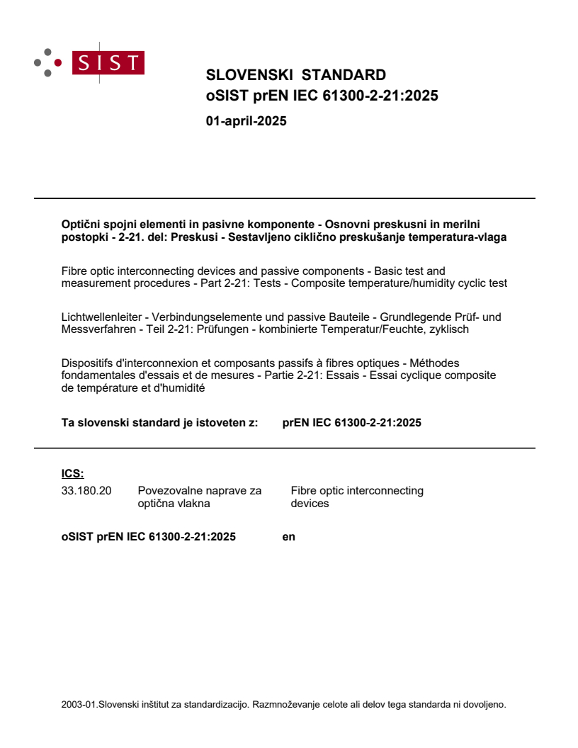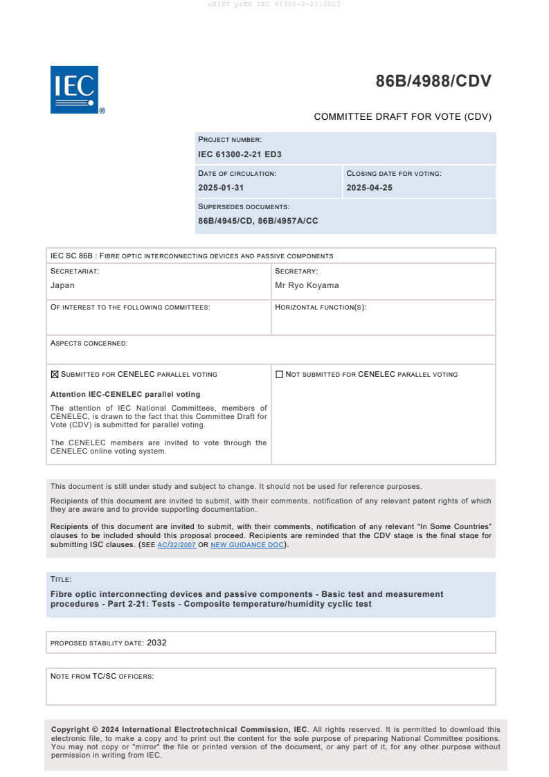 The prEN IEC 61300-2-21:2025 standard, titled "Fibre optic interconnecting devices and passive components - Basic test and measurement procedures - Part 2-21: Tests - Composite temperature/humidity cyclic test," is developed by CLC under IEC technical committee 86. This international standard specifies a comprehensive composite temperature and humidity cyclic test designed to evaluate the resistance and reliability of fibre optic devices and passive components when exposed to severe environmental conditions. It is intended to simulate harsh operational environments characterized by alternating high temperatures, high humidity, and sub-zero cold cycles.