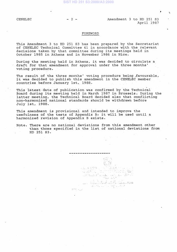 HD 251 S3:1982/A3:1987 is a amendment published by CLC. Its full title is "Safety of household and similar electrical appliances - Part 1: General requirements". This standard covers: D109/162: Publication withdrawn following withdrawal of HD 280.2 S1