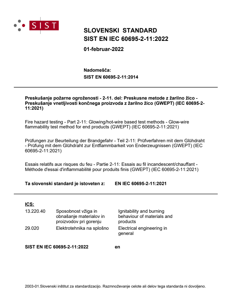 Preskušanje požarne ogroženosti - 2-11. del: Preskusne metode z žarilno žico - Preskušanje vnetljivosti končnega proizvoda z žarilno žico (GWEPT) (IEC 60695-2-11:2021)