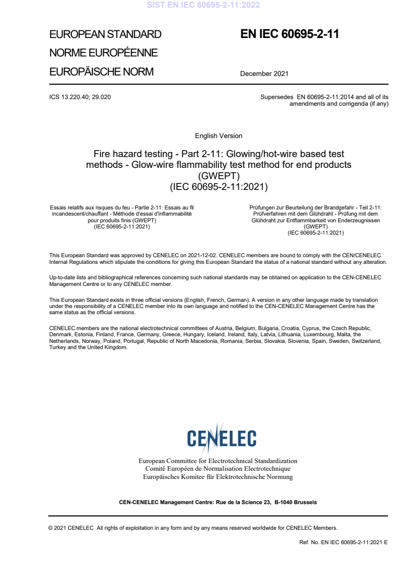 EN IEC 60695-2-11:2021 - "Fire hazard testing - Part 2‑11: Glowing/hot‑wire based test methods - Glow‑wire flammability test method for end products (GWEPT)" - defines a laboratory test method to evaluate how an end product reacts when contacted by an electrically heated (glow) wire. The GWEPT simulates thermal stresses caused by overheated conductors, bad connections or component faults to determine whether a product has a limited ability to ignite or to propagate flame under defined conditions. This standard is a basic safety publication intended to support technical committees, manufacturers and test laboratories in product safety assessments. It supersedes EN 60695‑2‑11:2014 and is to be used alongside IEC 60695‑2‑10.