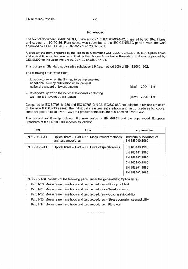 EN 60793-1-32:2003 has the following relationships with other standards: It is inter standard links to EN 188000:1992, EN 60794-1-2:2003, EN 60793-2-50:2008, EN 60793-1-1:2003, EN 60793-2-50:2004, EN 60793-2-10:2007, EN 60793-2-40:2011, EN 60793-2-60:2008, EN 60793-1-52:2002, EN 60794-3:2002, EN 60793-2-10:2004, EN 60793-1-53:2002, EN 61753-143-2:2013, EN 60793-2-10:2002, EN 60794-1-20:2014. Understanding these relationships helps ensure you are using the most current and applicable version of the standard.