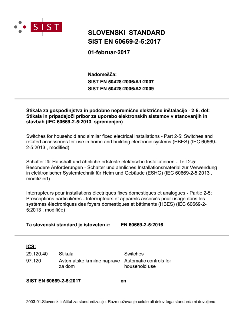 EN 60669-2-5:2016 (CLC adoption of IEC 60669-2-5:2013, modified) is the European standard that specifies particular requirements for switches and related accessories used in Home and Building Electronic Systems (HBES). It applies to HBES switches with a working voltage up to 250 V a.c. and a rated current up to and including 16 A, for household and similar fixed electrical installations both indoors and outdoors, and to associated electronic extension units. This document supplements the general and collateral parts of the EN 60669 series and is a harmonized CENELEC standard supporting relevant EU Directives.