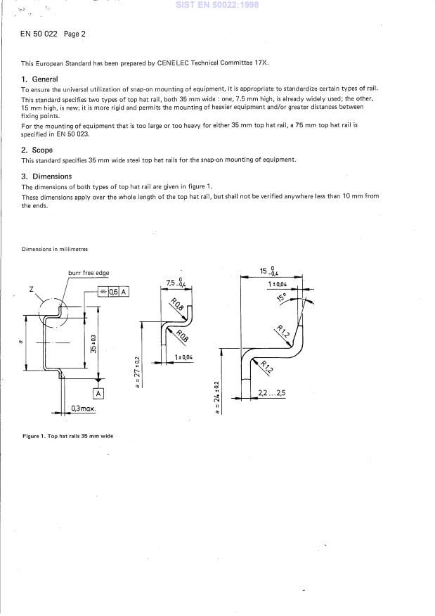 EN 50022:1977 is a standard published by CLC. Its full title is "Low-voltage switchgear and controlgear for industrial use - Mounting rails - Top hat rails 35 mm wide for snap-on mounting of equipment". This standard covers: This standard specifies 35 mm wide steel top hat rails for the snap-on mounting of equipment